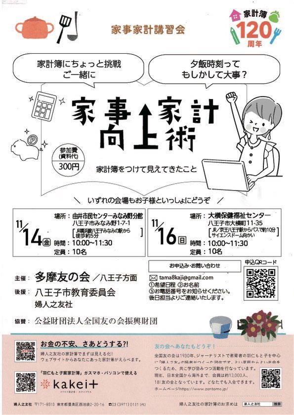 家事家計講習会 2025年度 家事家計向上術 家事家計向上術 11/14(金)10-11:40 由井市民センターみなみ野分館 11/16(日)10-11:40 大横保健福祉センター 緑のボタンからお申込ください お申込・お問合せ tagPlaceholderカテゴリ: 八王子