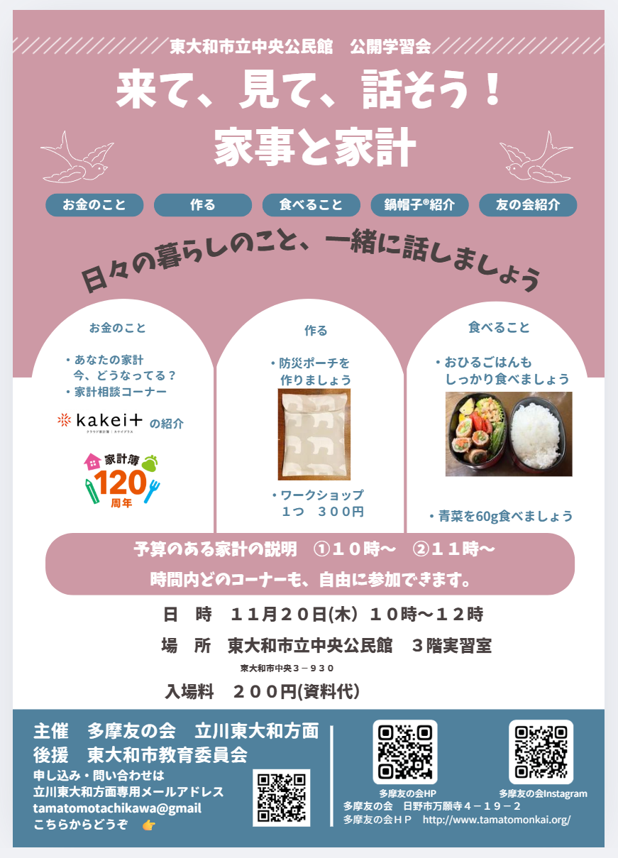 家事家計講習会 来て、見て、話そう!家事と家計 日時:11月20日(木) 10-12時 会場:東大和市立中央公民館 3階実習室 入場料:200円(資料代) お申込・お問い合わせは緑のボタンよりお願いいたします。 申込・お問合せ tagPlaceholderカテゴリ: